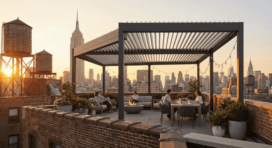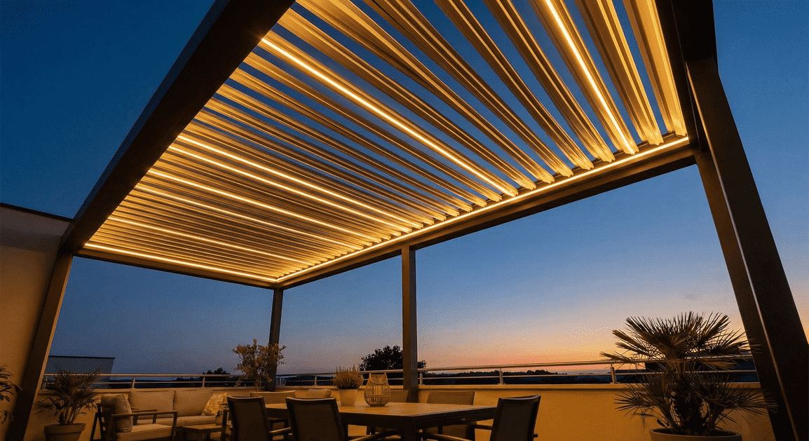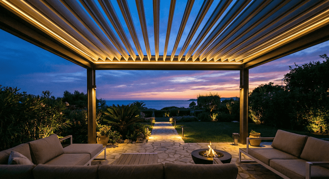 Sculpting the Climate The ultimate architectural solution. Adjustable aluminum blades allow you to modulate sunlight and ventilation naturally. When closed, they become a watertight roof. Integrated with sliding glass doors and heating systems, our pergolas transform an outdoor space into a year-round living area.