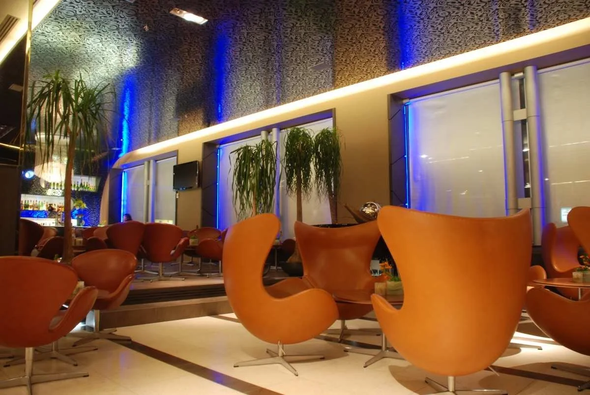 The relationship between the hotel and the city is underlined by the large windows in the hall: to screen the